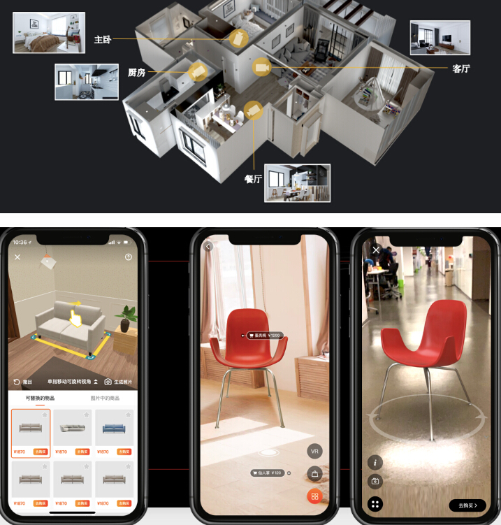 眼下,进入一家家具品牌的天猫旗舰店后,消费者看到的是各类家具单品以及多种家居场景的平面效果图。未来,你能看到一整套房子的智能3D实景图与视频,宛若身处样板间。并且可以像玩游戏一般为这套房子的客厅更换款式、颜色更合适的家具,以及调整家具的摆放位置。